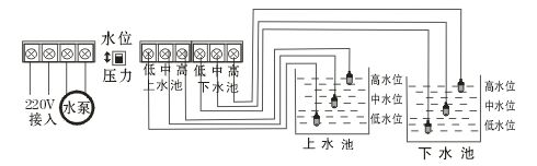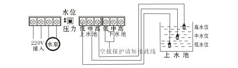 下水池用訊號線需跟廠家另行訂購,不能設置空載(即空載為000)。上水池的水用到中水位時會開始抽水,抽到高水位會水滿停機。下水池滿至高水位時會開始抽水,抽到中水位時會停機,即缺水保護。上、下水池之低水位訊號線都是起回路作用。