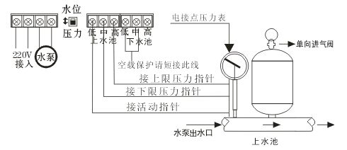 6、壓力接法:將控制器“壓力、水池”選擇開關(在訊號線接線端子上端)撥 到“壓力” 檔,然后將上水池訊號線高中低水位與電接點壓力表高中低壓力位對接。